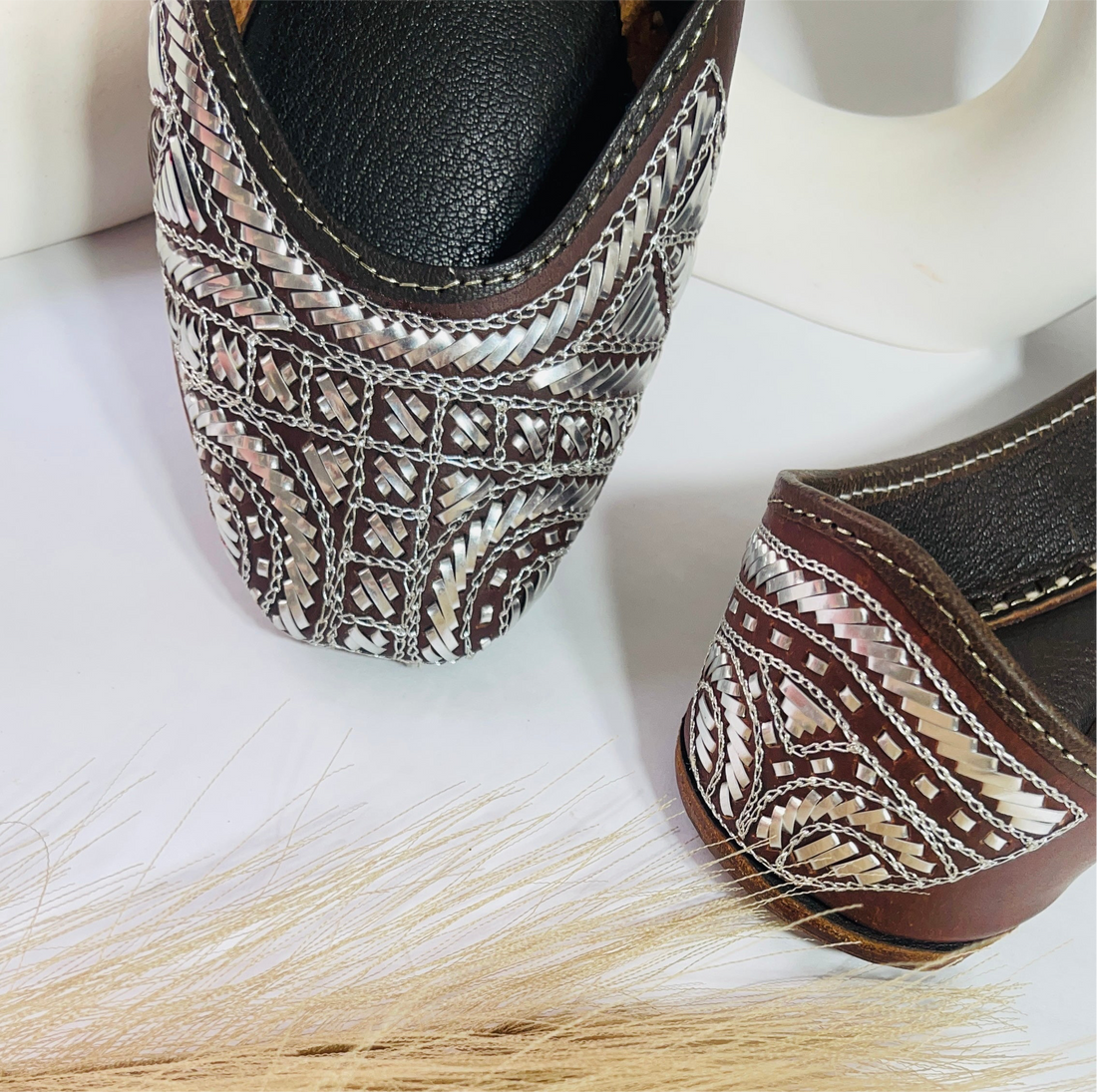 A timeless classic in deep brown, highlighted with intricate silver mukaish embroidery. These handcrafted juttis...