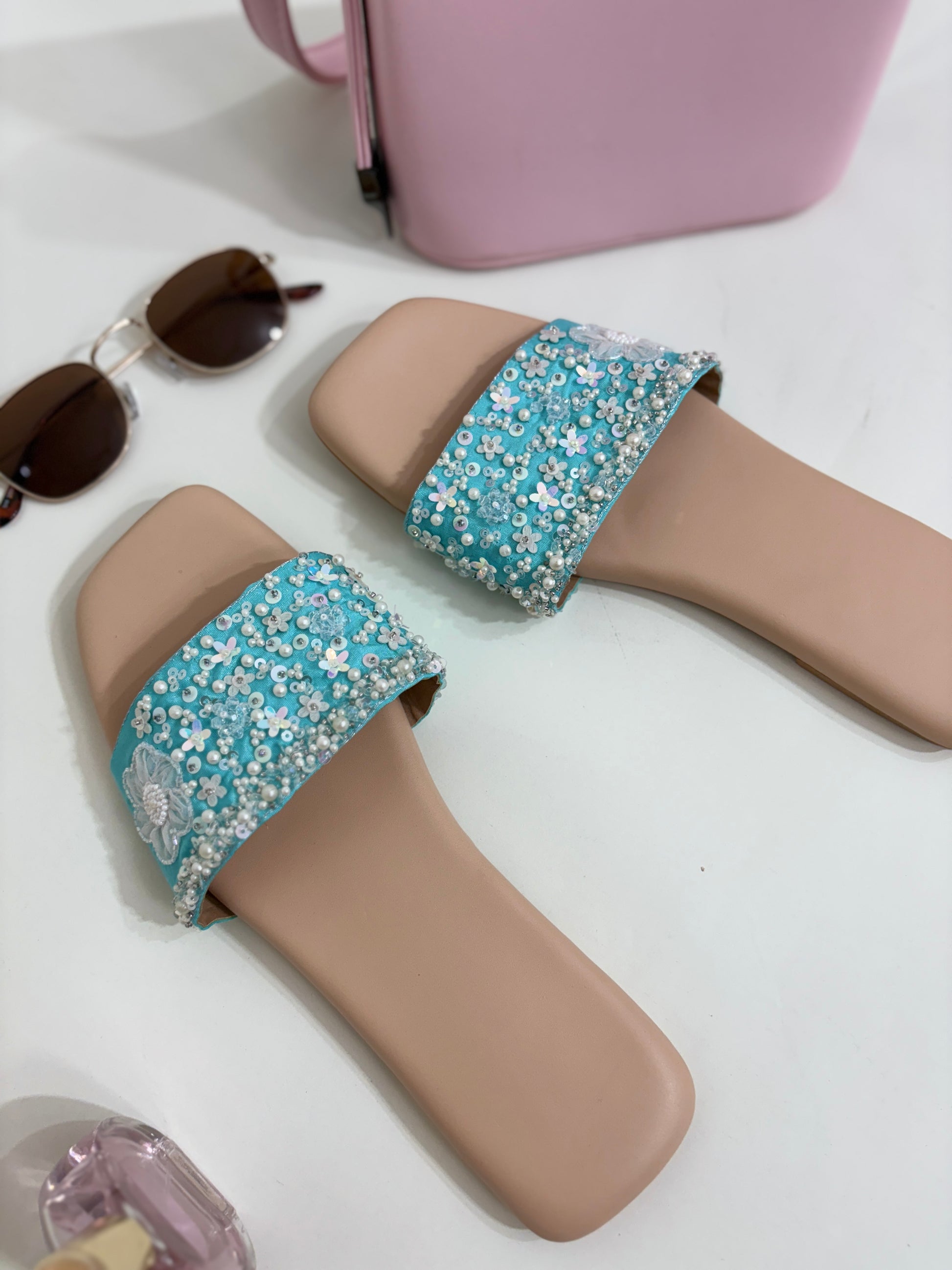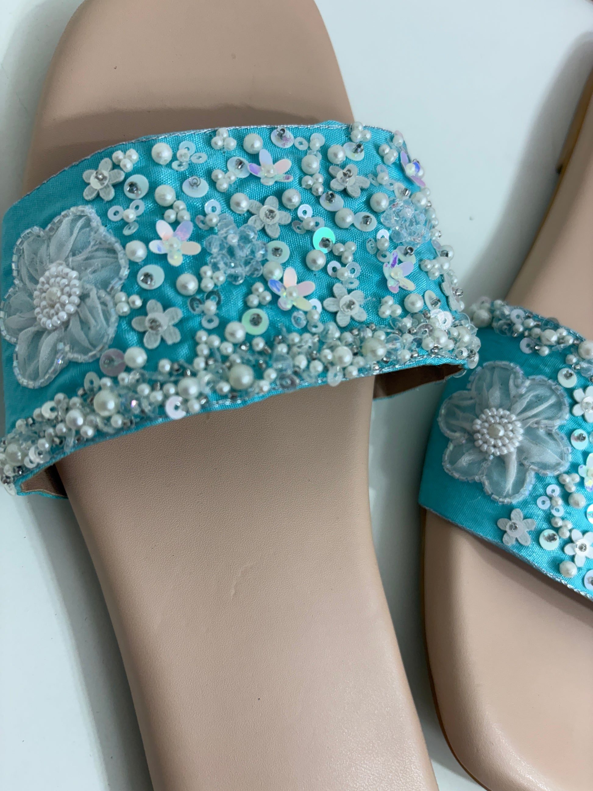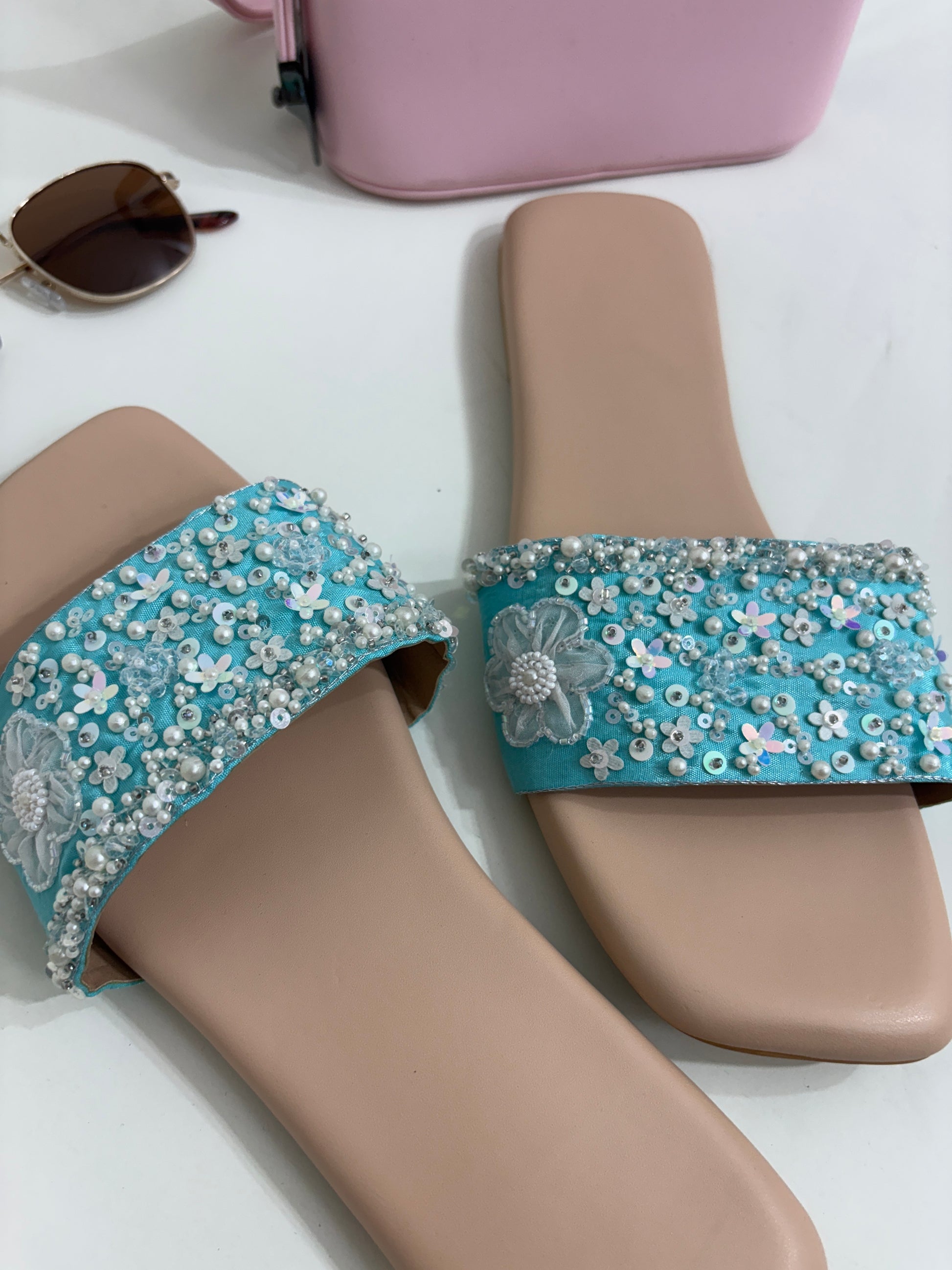 These hand-embroidered aqua flats are a dreamy blend of shimmer, pearls, and floral elegance — made for festive days and breezy brunches alike.✨