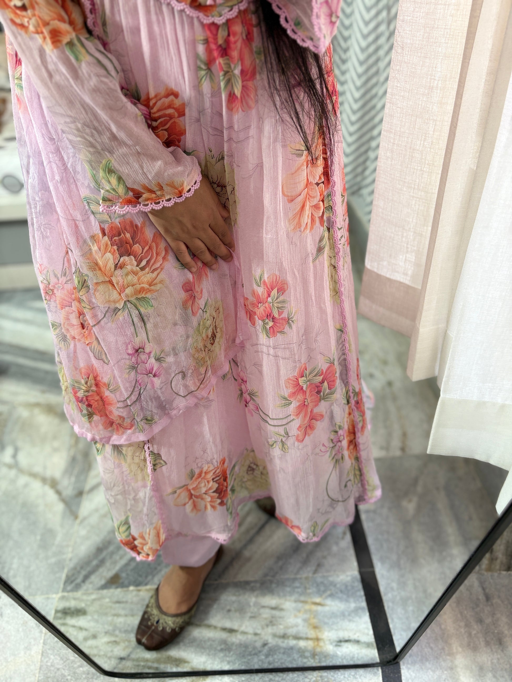Grace in every thread !! Draped in this dreamy baby pink georgette suit, adorned with real mirror work and delicate sippi handwork.