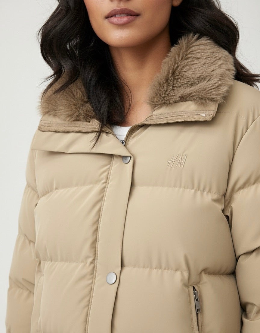 Beige Puffer Jacket with Faux Fur Collar