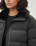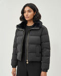 This is a fashionable, cropped black puffer jacket featuring a warm, quilted design. The jacket is highlighted by a plush black faux-fur collar for a luxurious and cozy feel.