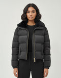The short, modern length and elasticized cuffs make it a chic choice for insulating warmth while maintaining a streamlined, contemporary silhouette.