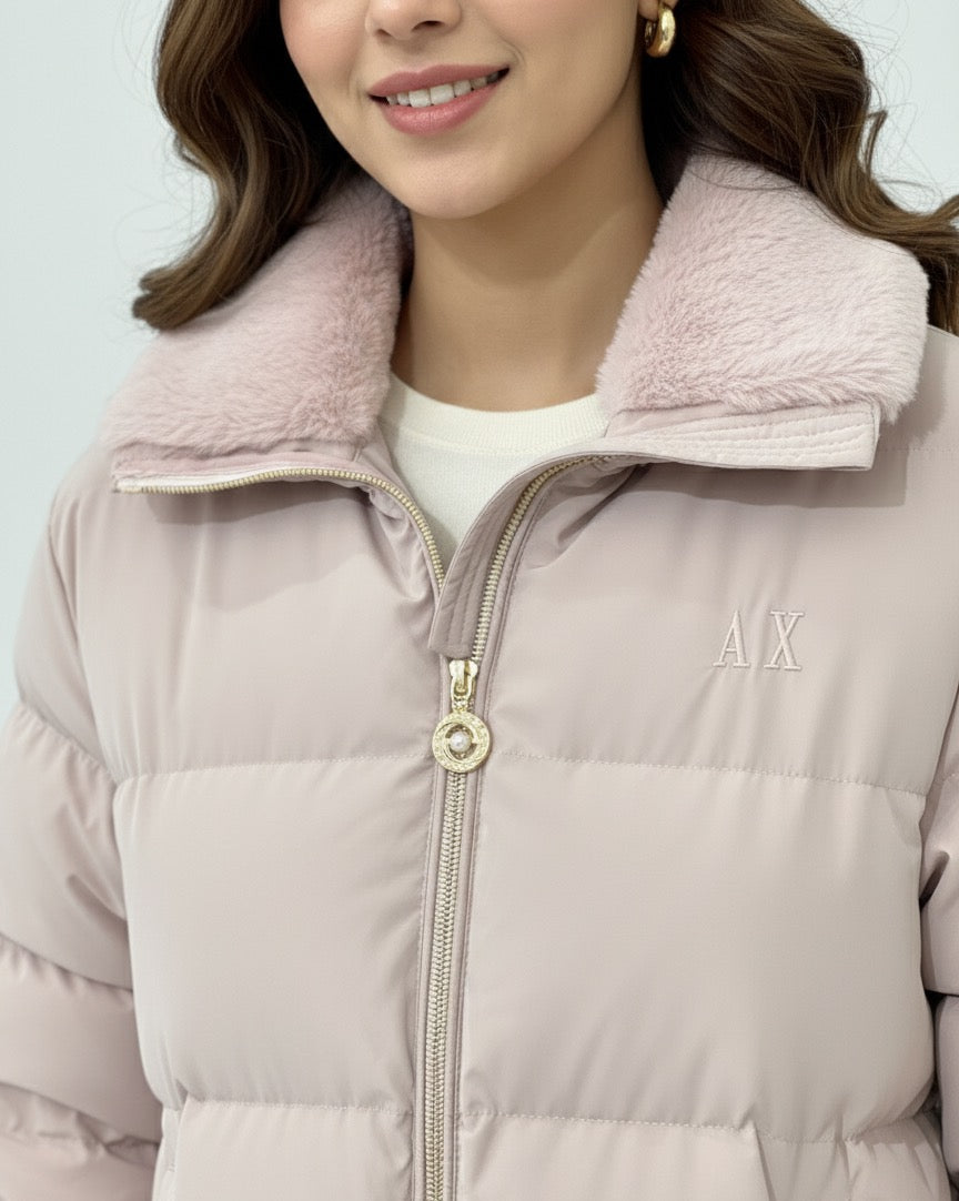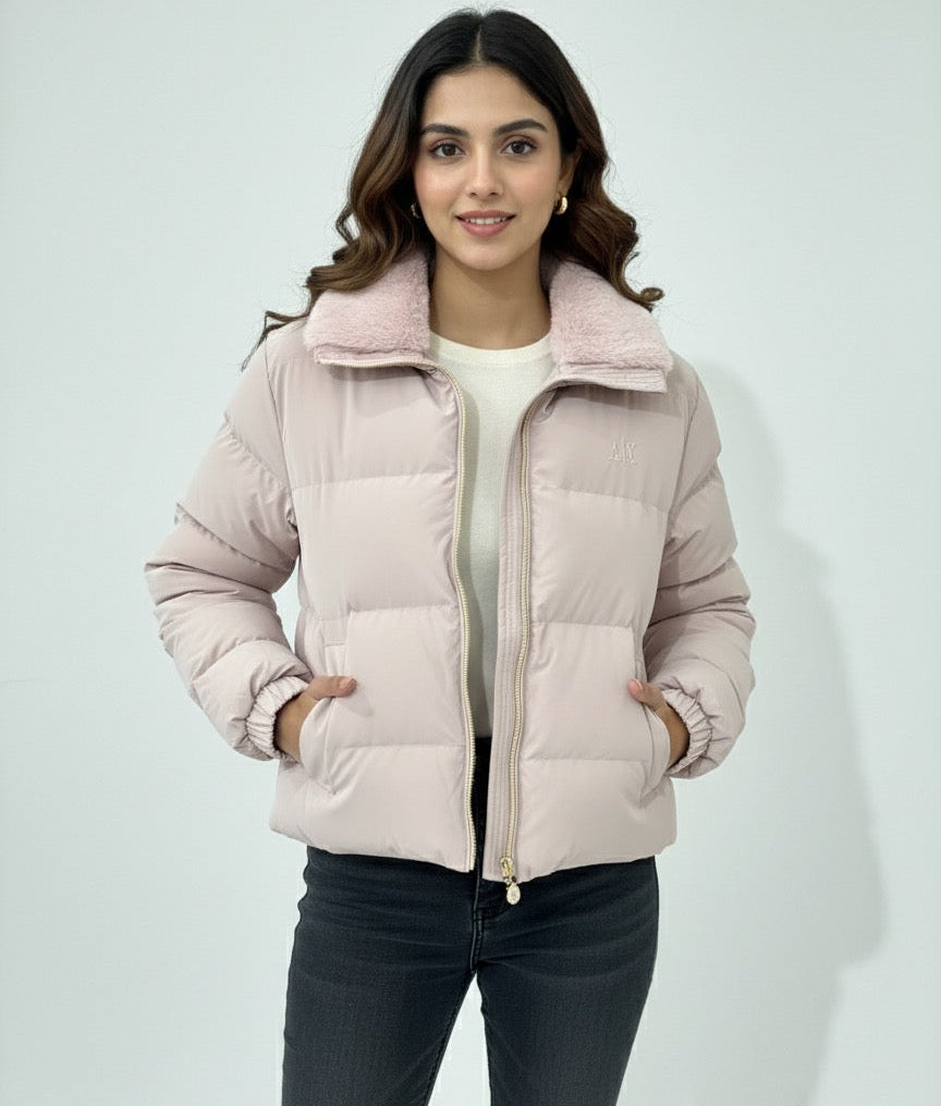This is a stylish, contemporary cropped puffer jacket in a soft blush or light pink shade. It features a cozy, luxurious faux-fur collar in a matching pink tone, providing extra warmth and a refined touch.