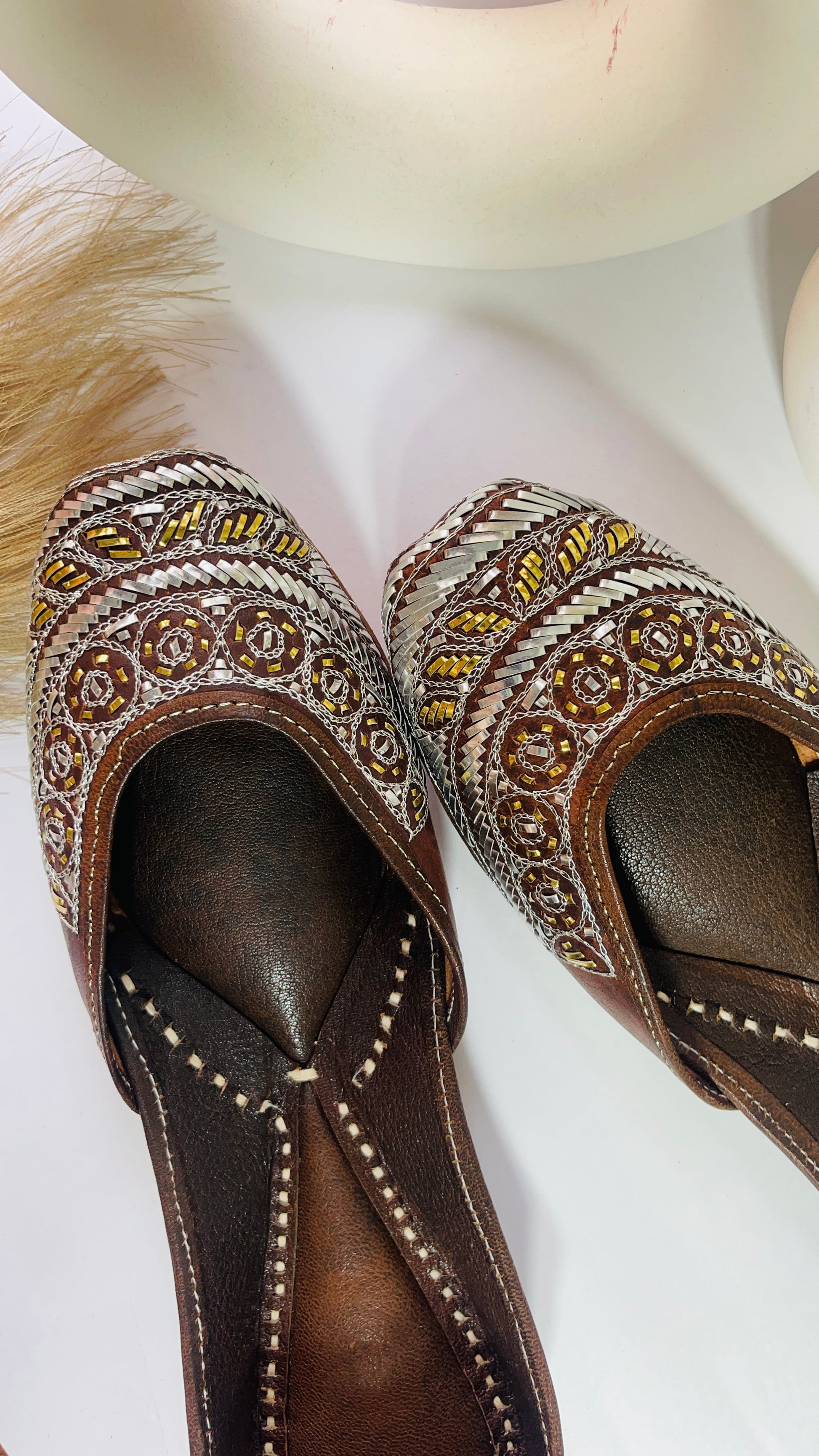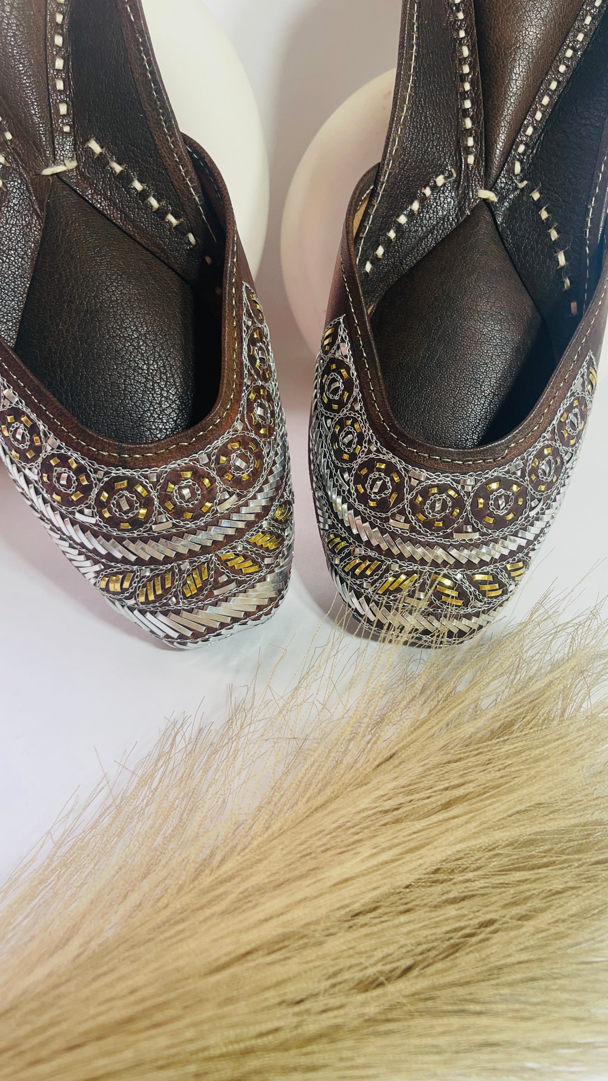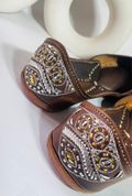 A blend of timeless craftsmanship and subtle shimmer, these brown juttis feature intricate mukaish embroidery with silver and golden detailing.