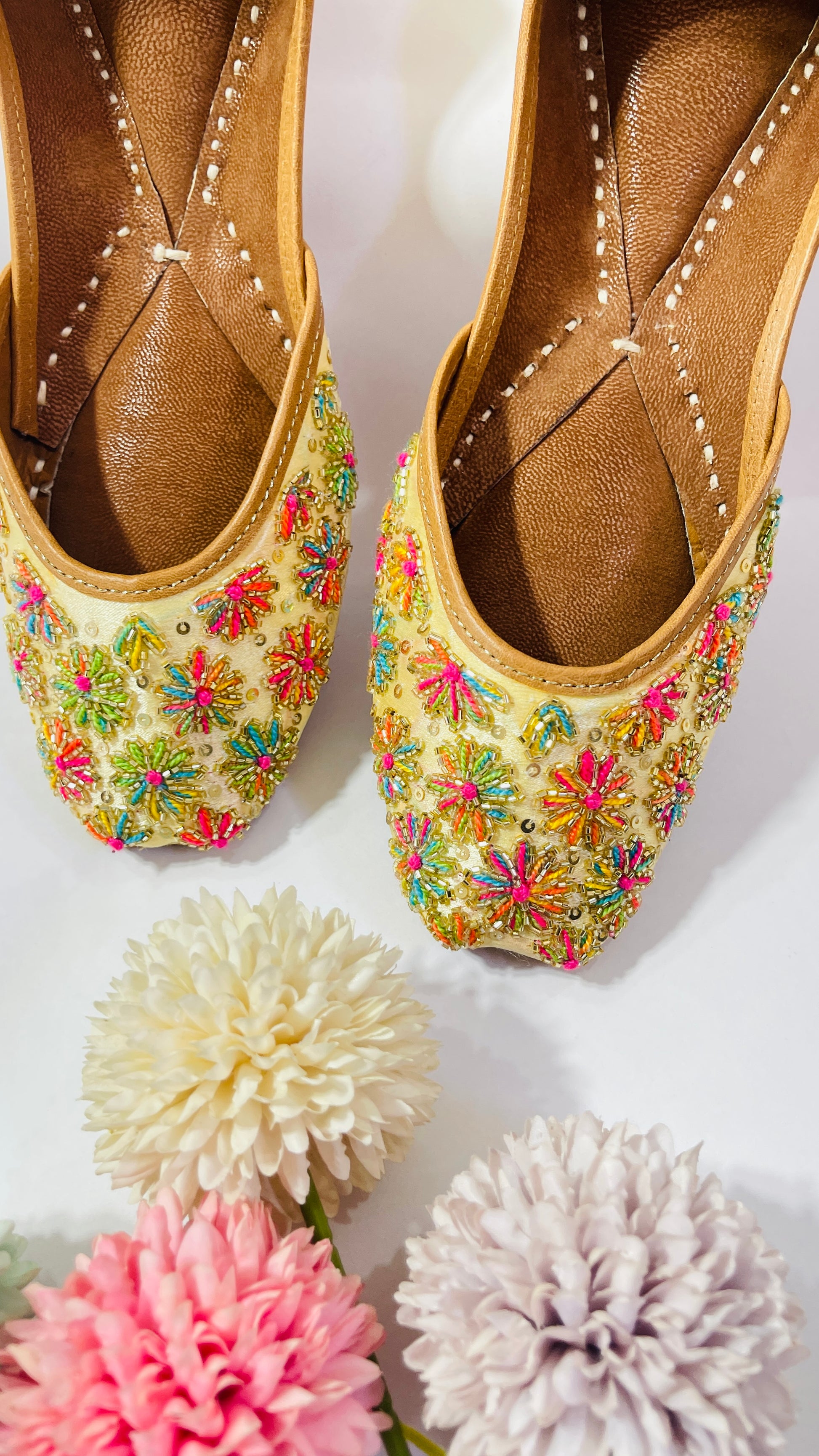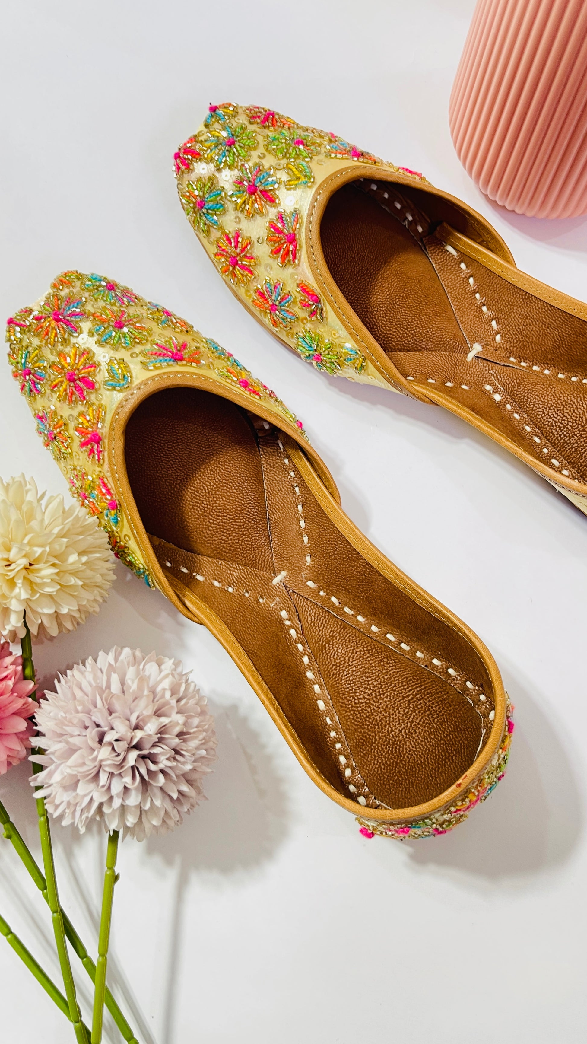 Elevate your festive style with this exquisite golden jutti, meticulously handcrafted with vibrant floral embroidery and delicate sequin embellishments.