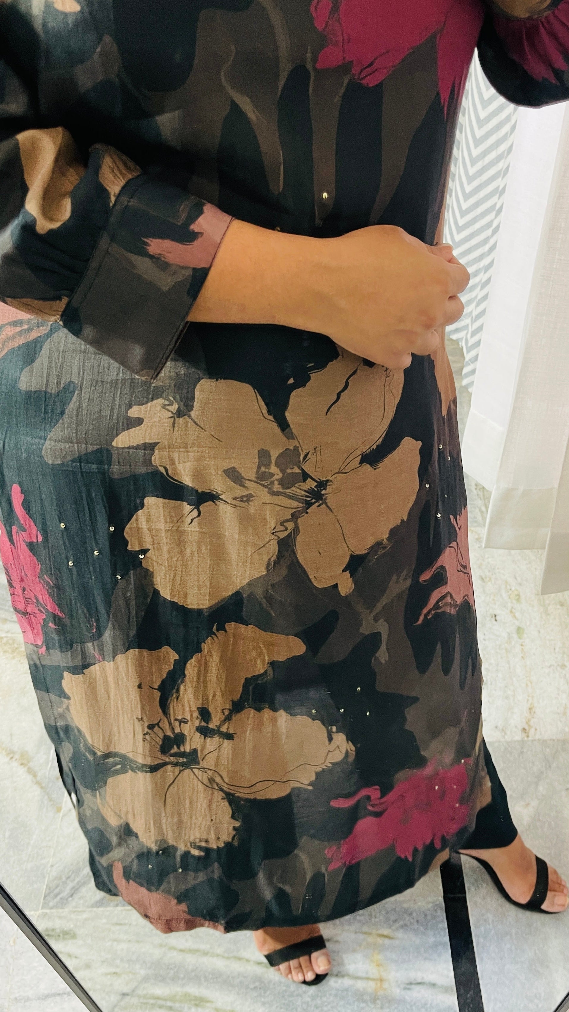 This floral print kurta set, featuring subtle sequin work on the V-neck, is your go-to for everyday elegance. Light, breezy and effortlessly stylish !!