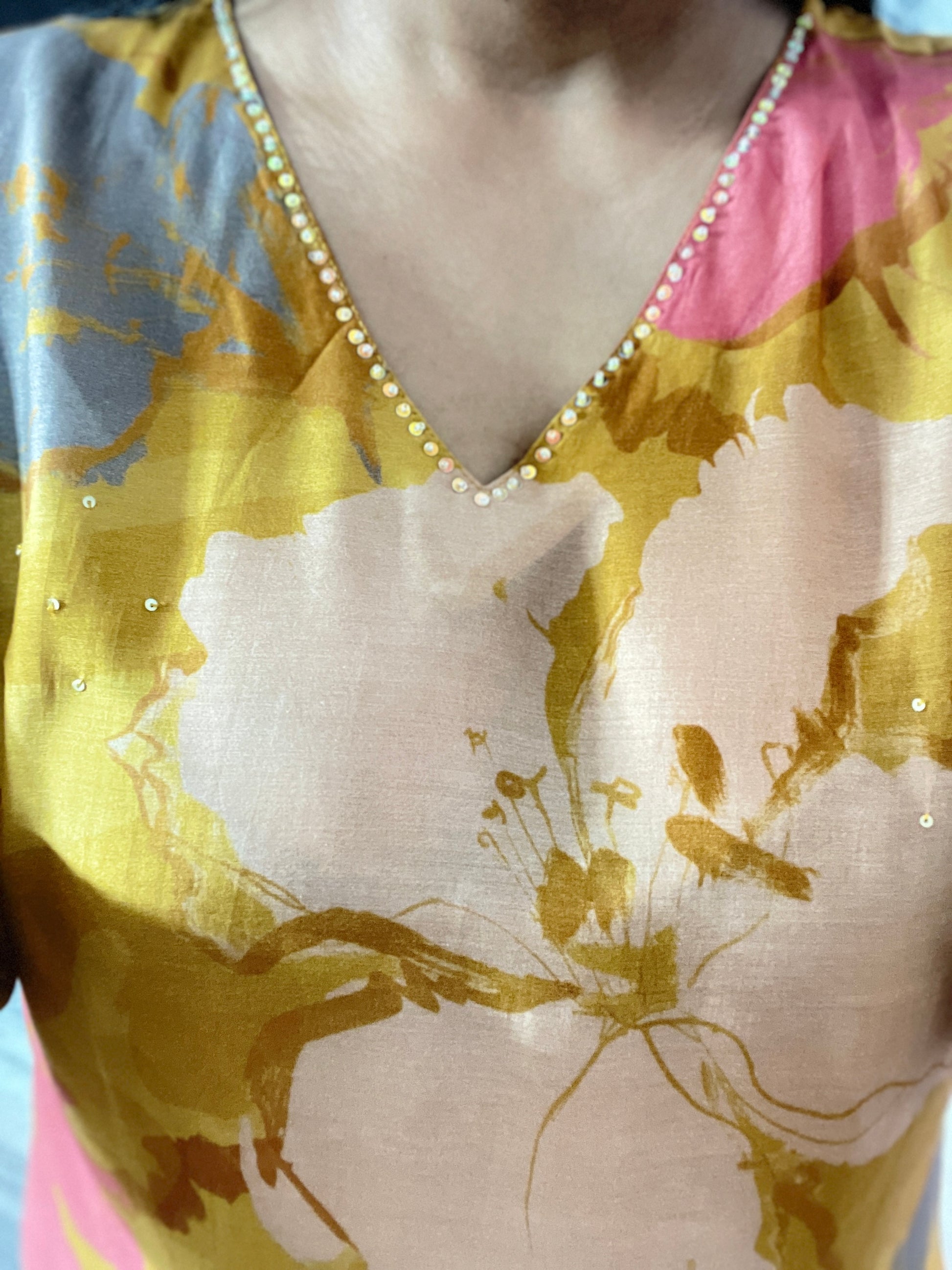 This floral print kurta set, featuring subtle sequin work on the V-neck, is your go-to for everyday elegance. Light, breezy and effortlessly stylish !!