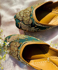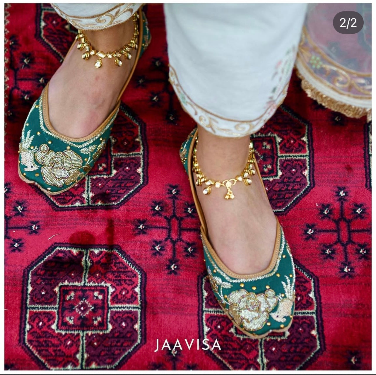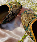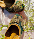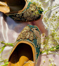 • A beautiful blend of tradition and elegance, these handcrafted juttis feature intricate zari and bead embroidery with a delicate bird motif perched amidst blooming florals.