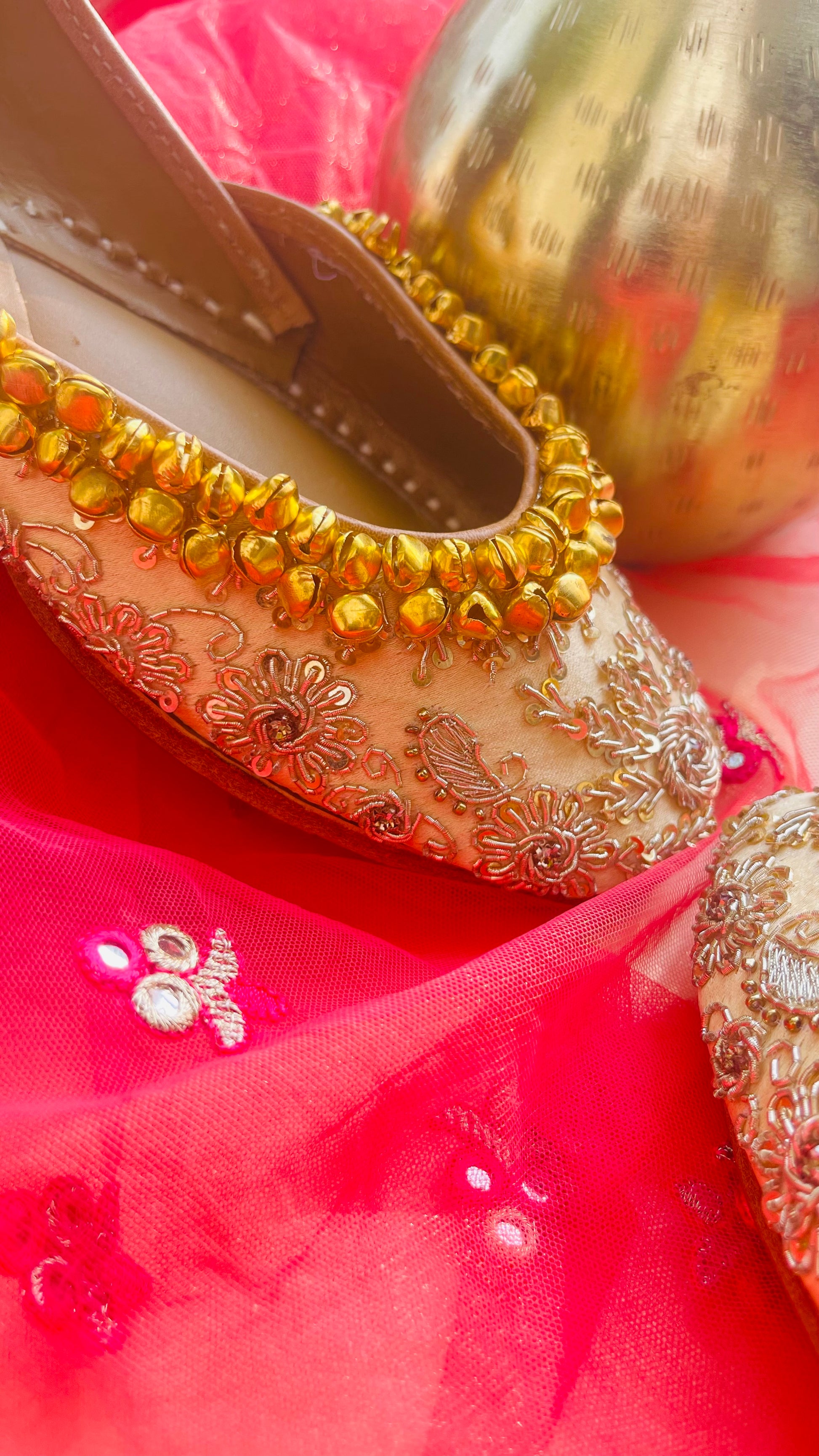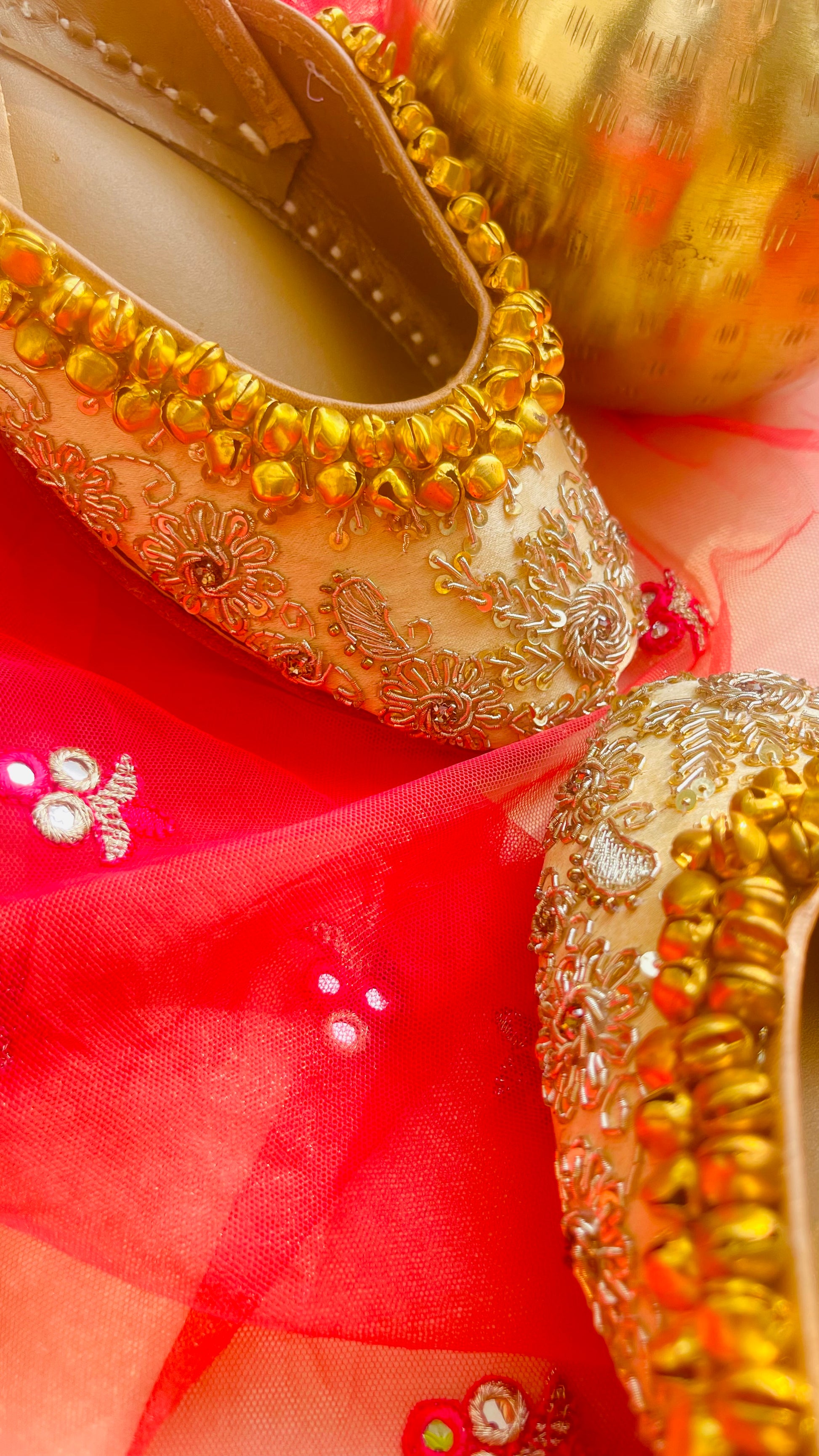 • Turn heads with every step in these stunning handcrafted juttis, adorned with intricate zardozi embroidery and traditional golden ghungroos.