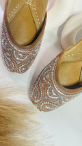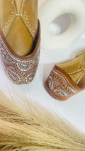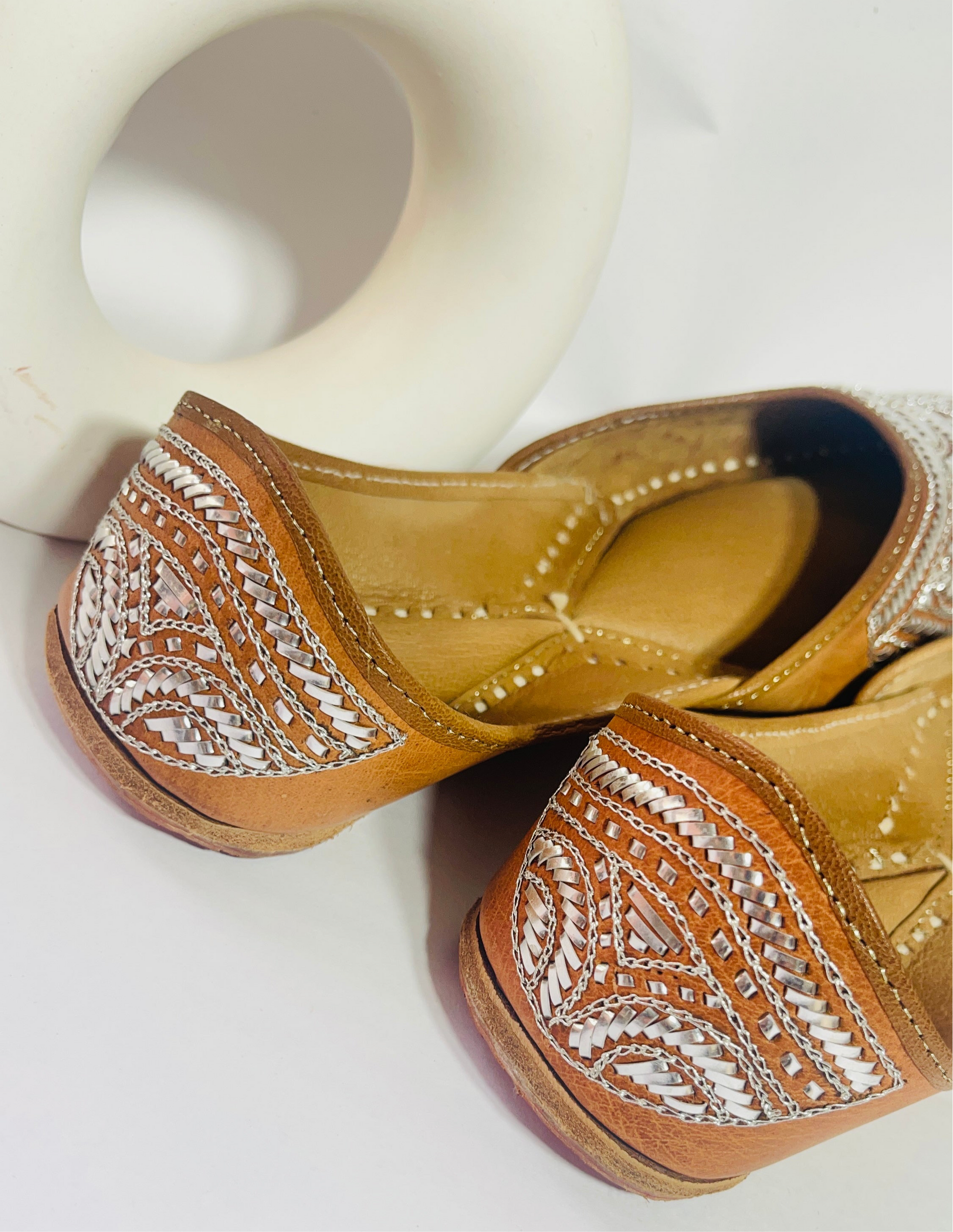 The subtle shimmer of hand-done mukaish embroidery on rich tan leather makes them a versatile pick for festive wear, weddings, or elevating your everyday outfits.