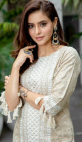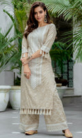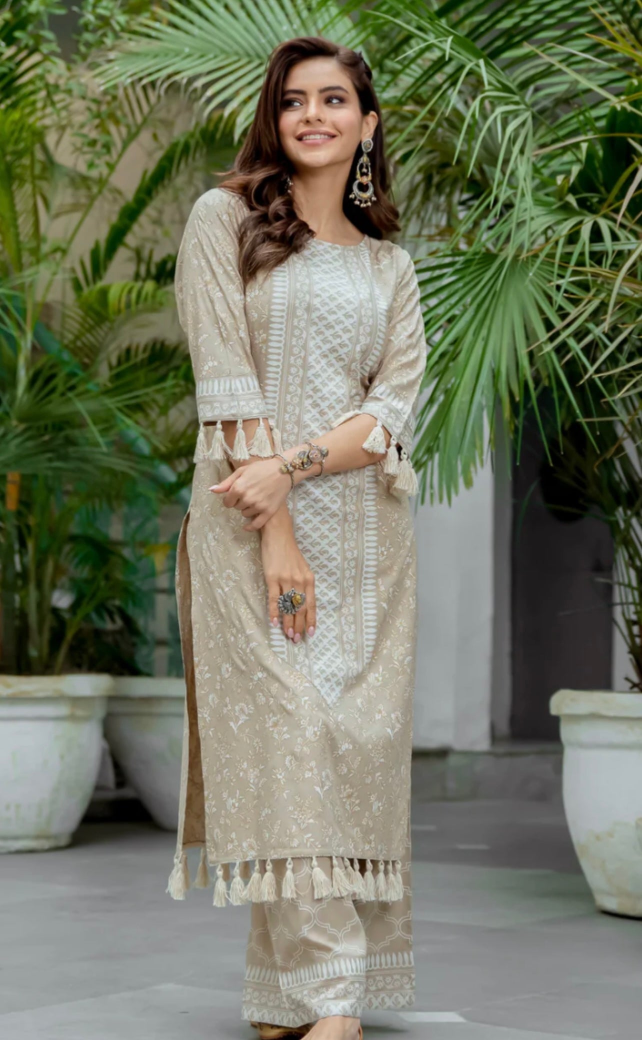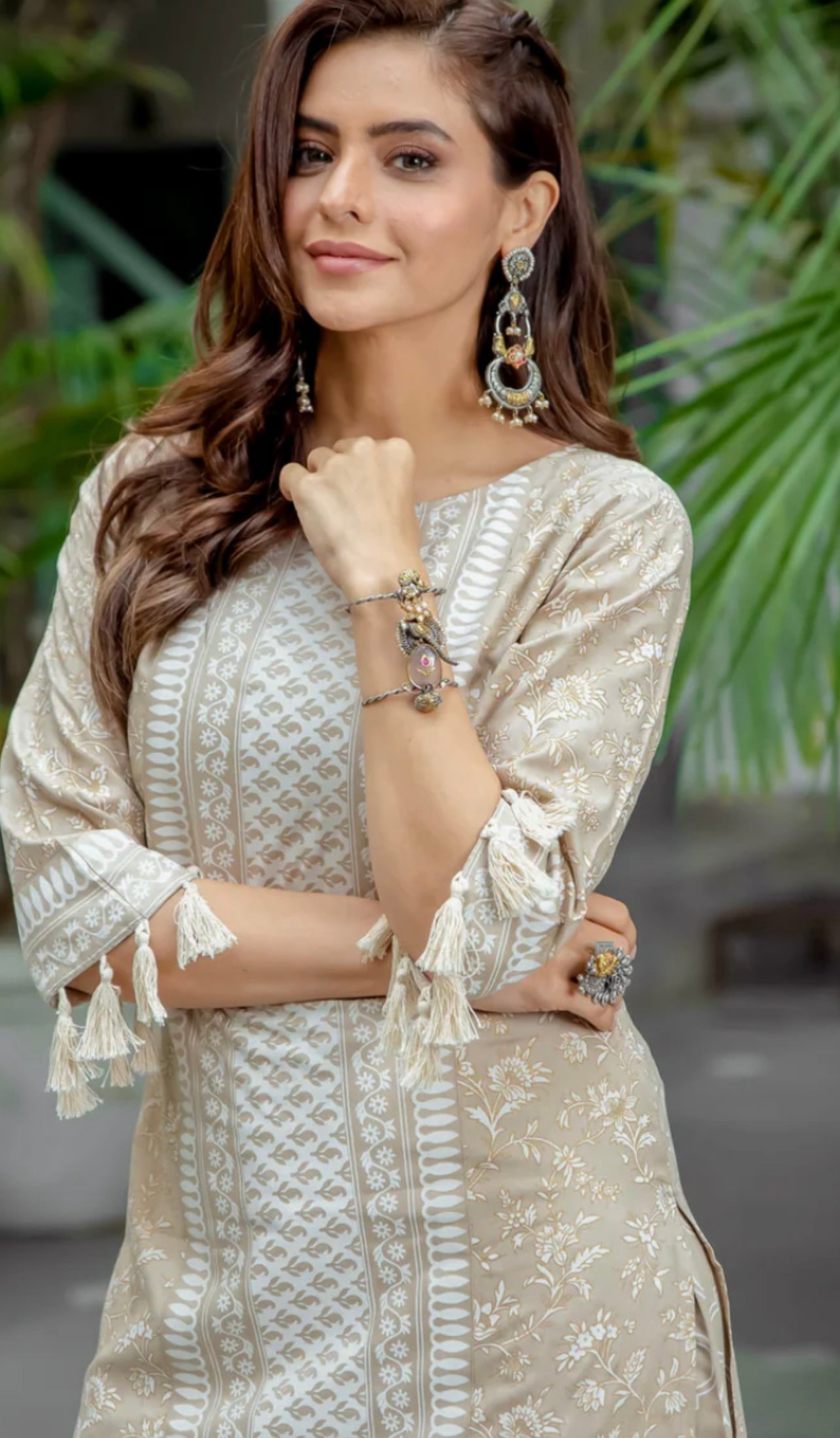 Pure cotton kurti in soothing neutral tones - perfect for summer days, finished with delicate tassels at the hem for that extra charm.