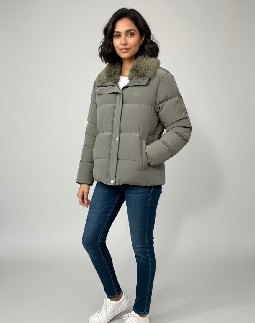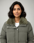 Olive Green Puffer Jacket with Faux Fur Collar