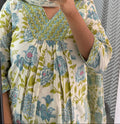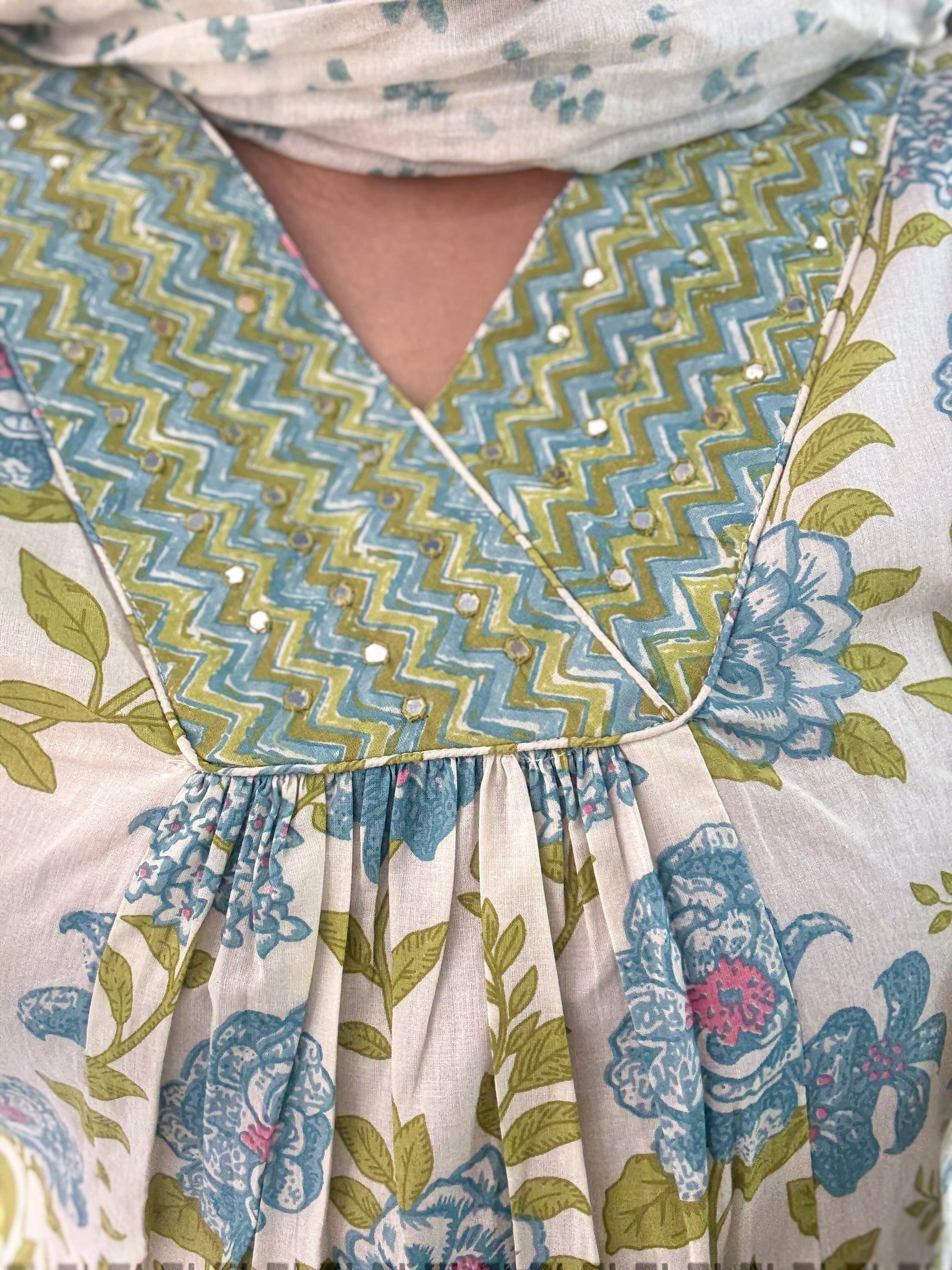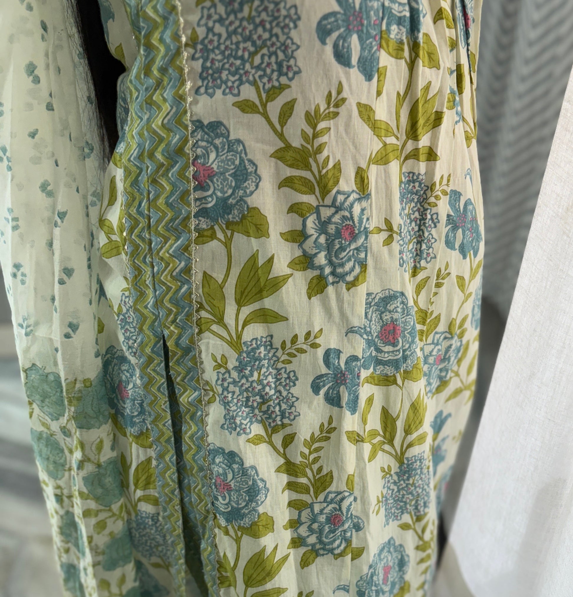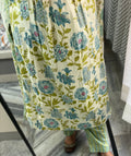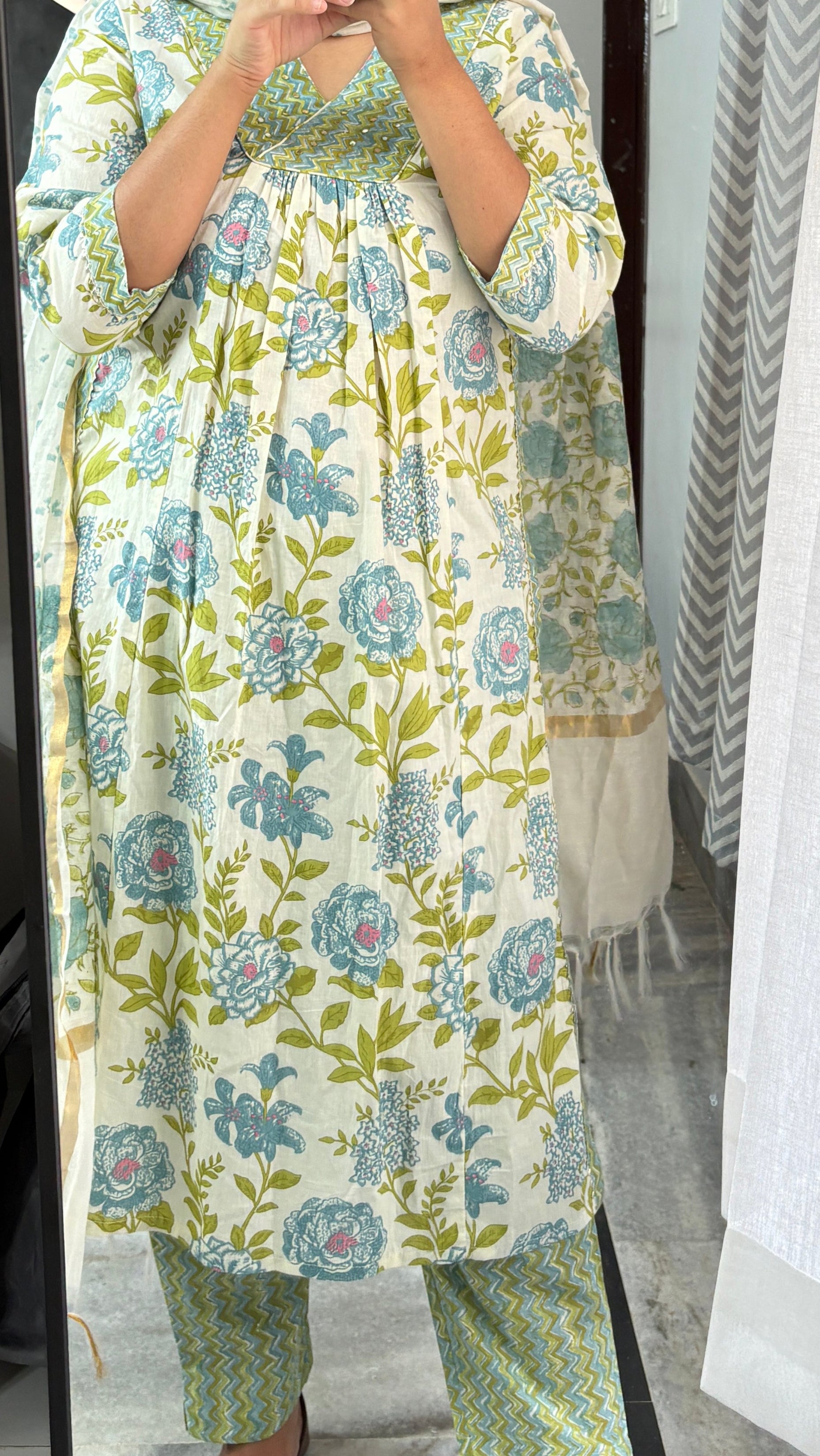 Refresh your wardrobe with this soothing cream kurta adorned with delicate blue and green floral motifs. Paired with chevron-print pants and a light dupatta, this breezy cotton set blends comfort with effortless charm—perfect for daytime gatherings, casual Fridays, or leisurely brunches.