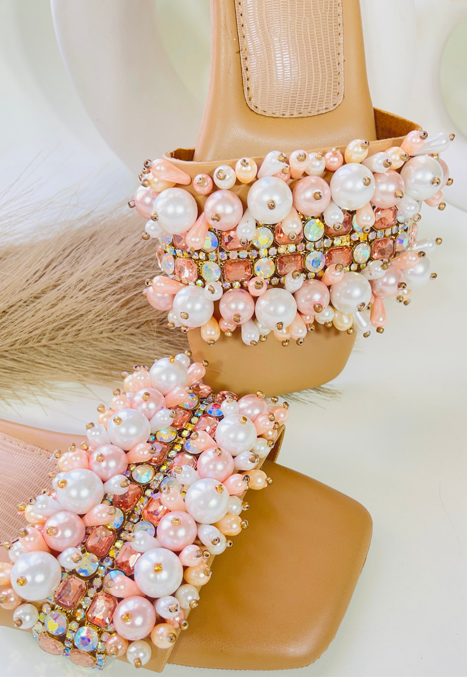 A perfect mix of elegance and charm, these Peach Pearl Embellished Slides feature hand-detailed clusters of peach and white pearls with shimmering crystals.