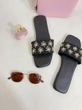 Step into effortless elegance with our handcrafted black slides, featuring intricate palm leaf embroidery in golden threads adorned with delicate pearl accents. Perfect for casual brunches or festive soirées, these slides blend contemporary chic with ethnic charm. Comfort meets couture — just for you.