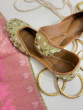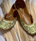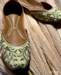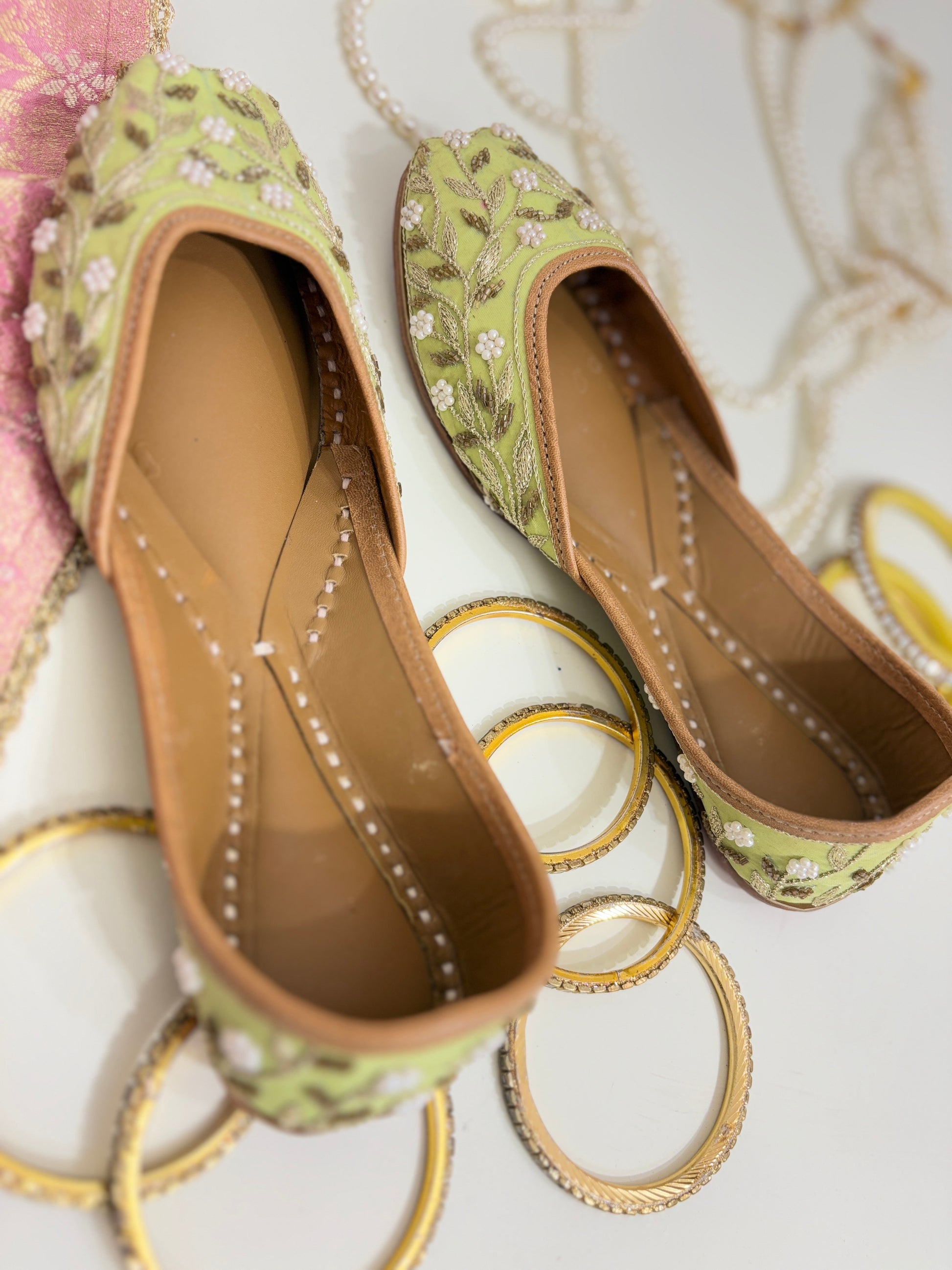 • Step into subtle elegance with these soothing pistachio green juttis, delicately hand-embroidered with pearl and zari floral motifs.