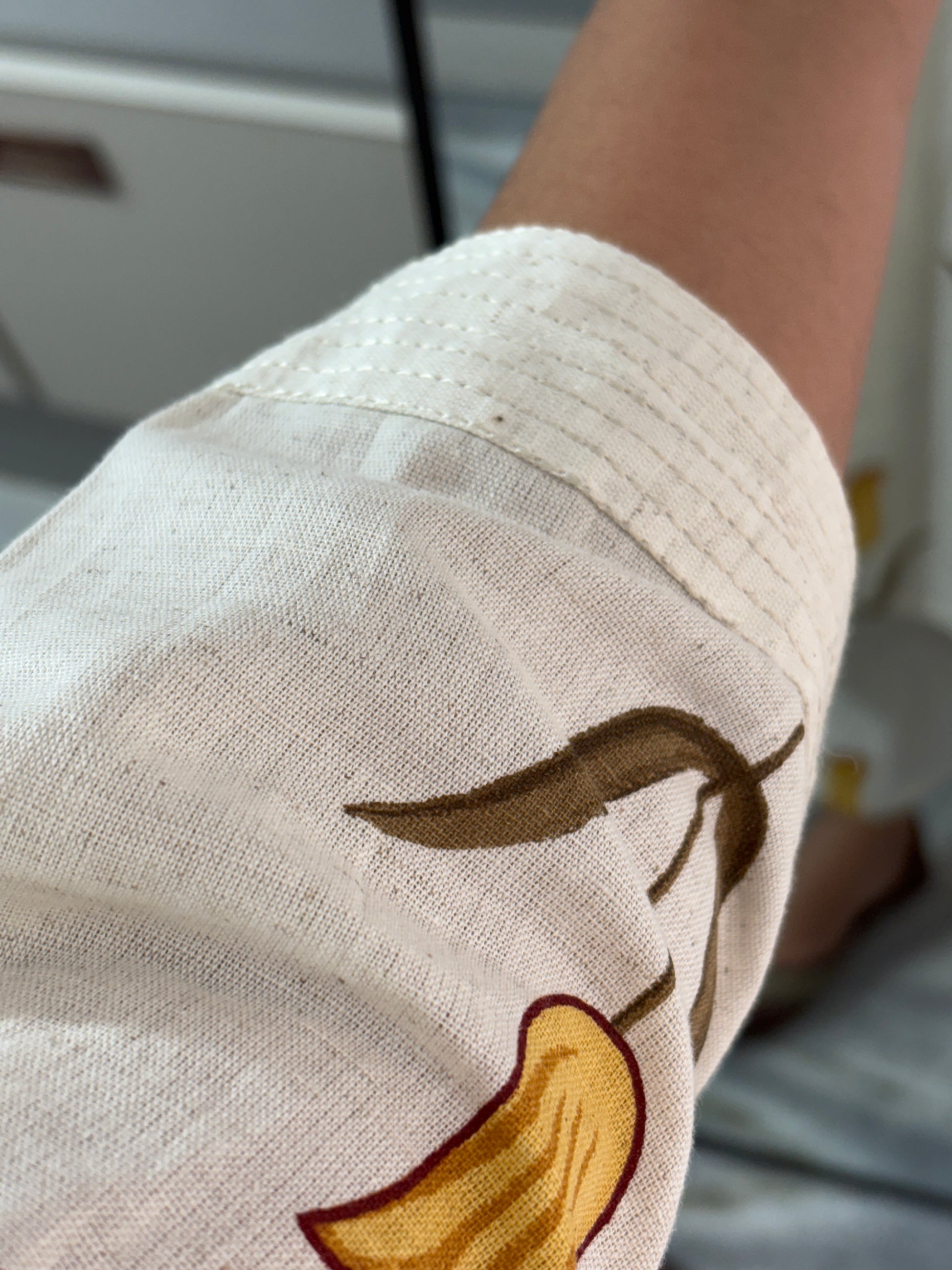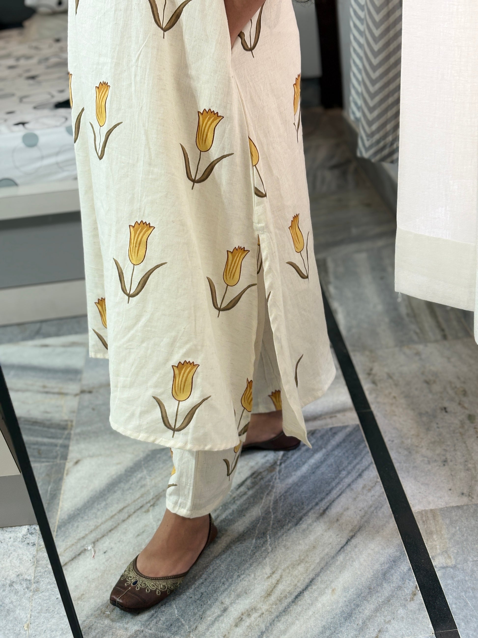 Delicate threadwork graces the neckline, while cheerful yellow tulips bloom across the kurti and palazzo set. Perfect for those who love effortless, earthy charm.