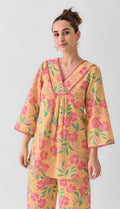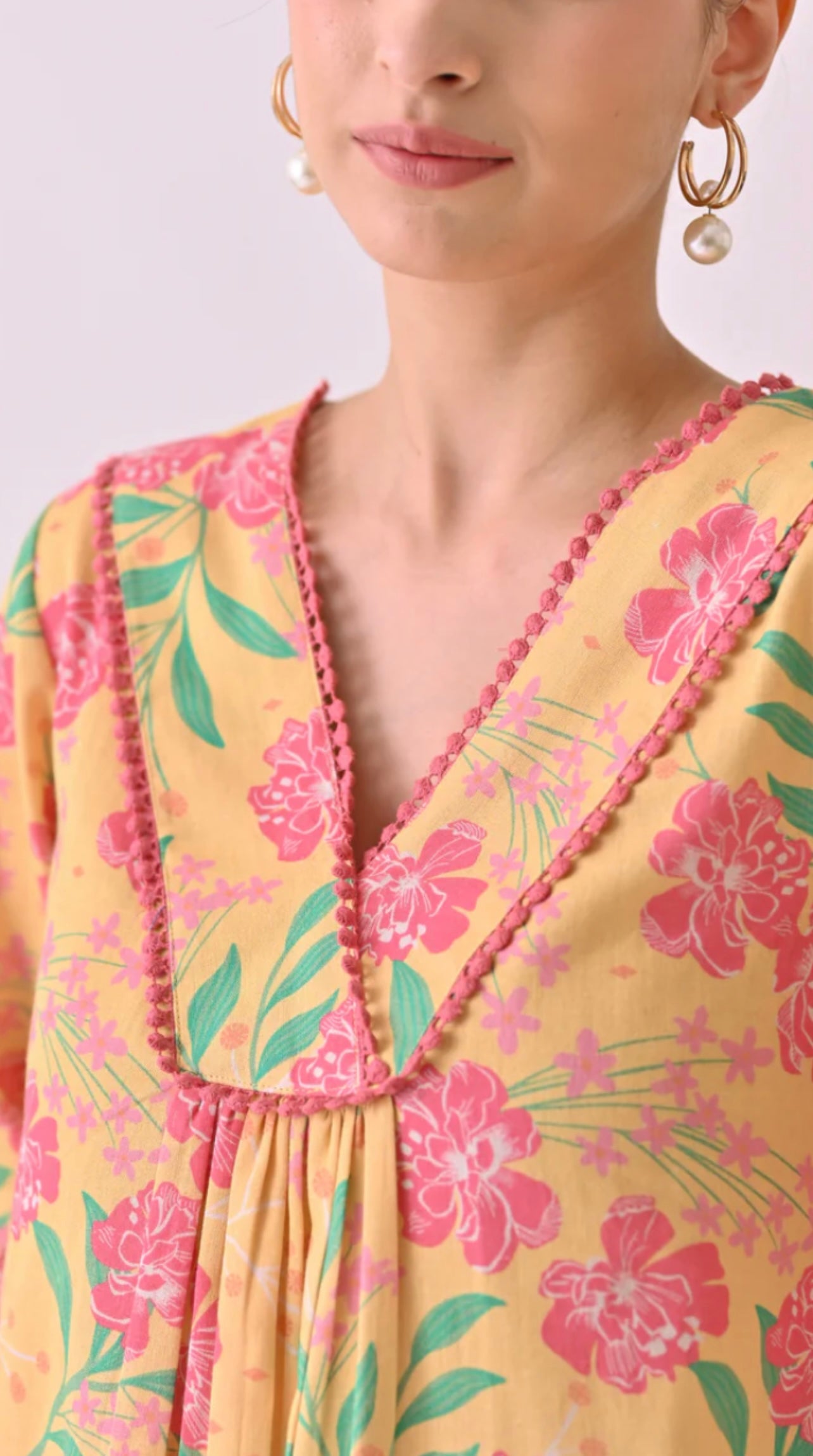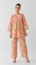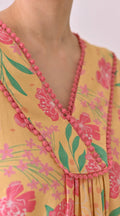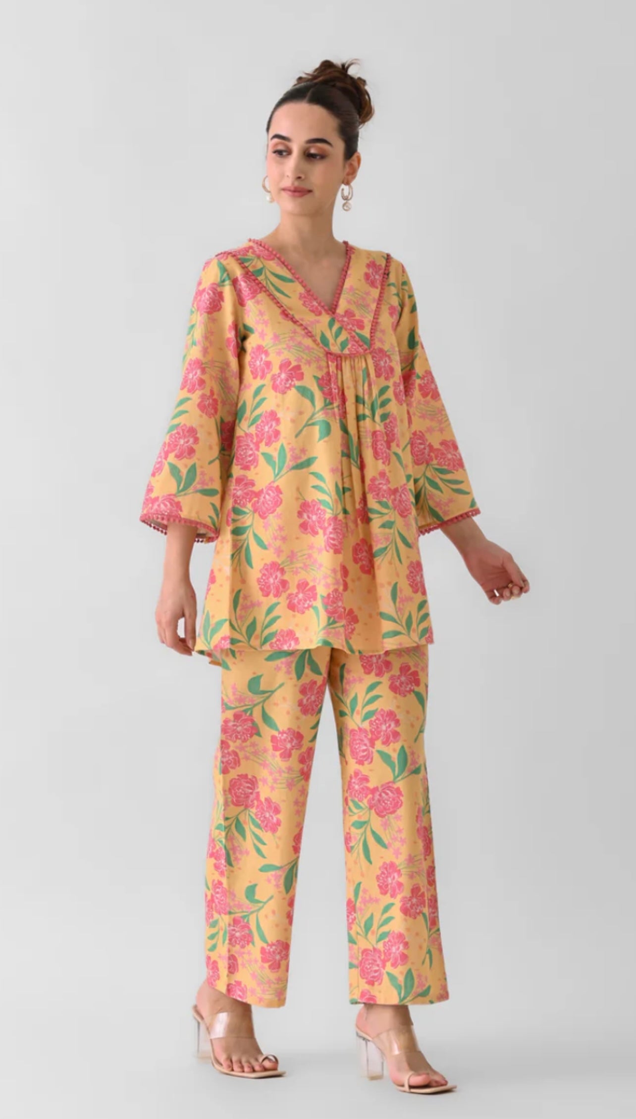 Bring a burst of freshness to your wardrobe with this vibrant yellow coord set, adorned with lively floral prints in shades of pink and green.